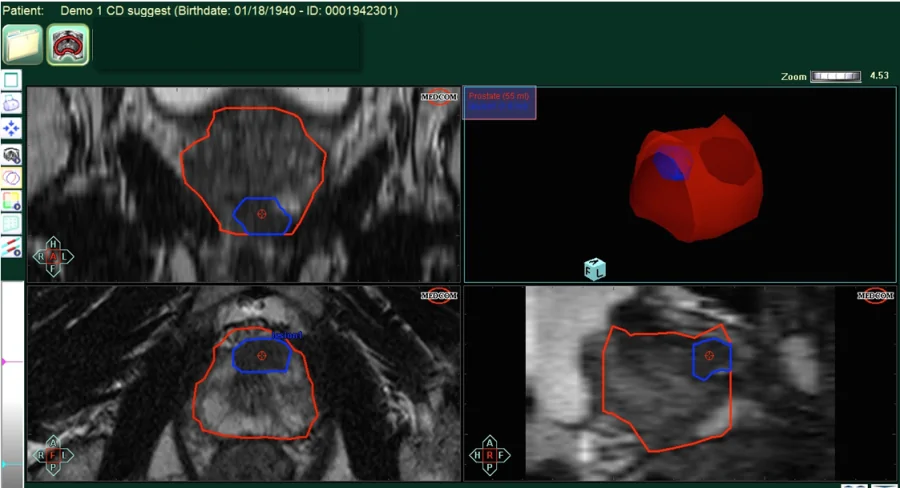 Κατά την πολυπαραμετρική μαγνητική τομογραφία προστάτη γίνεται πλήρης χαρτογράφηση του προστάτη σε όλη την έκταση του από την βάση προς την κορυφη (στην συγκεκριμένη εικόνα ο προστάτης έχει σχεδιαστεί με κόκκινο πλαίσιο), και παράλληλα σχεδιάζεται συγκεκριμμένα με ακρίβεια χιλιοστού η ύποπτη περιοχή για καρκίνο του προστάτη.Με τον τρόπο αυτό ο εξειδικευμένος ουρολόγος μπορεί και λαμβάνει βιοψίες ακριβώς από την ύποπτη περιοχή αυξάνοντας την διαγνωστική ακρίβεια της εξέτασης σε ποσοστά πάνω απο 95%.