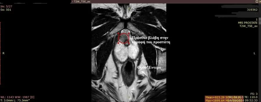 Εικόνα 3.Χαρακτηστική βλάβη στην πρόσθια ζώνη του προστάτη όπου η βλάβη όπως απεικονίζεται βρίσκεται μακριά από το ορθό έντερο καθιστώντας δύσκολη την λήψη της κατά την διορθική βιοψία εντέρου.